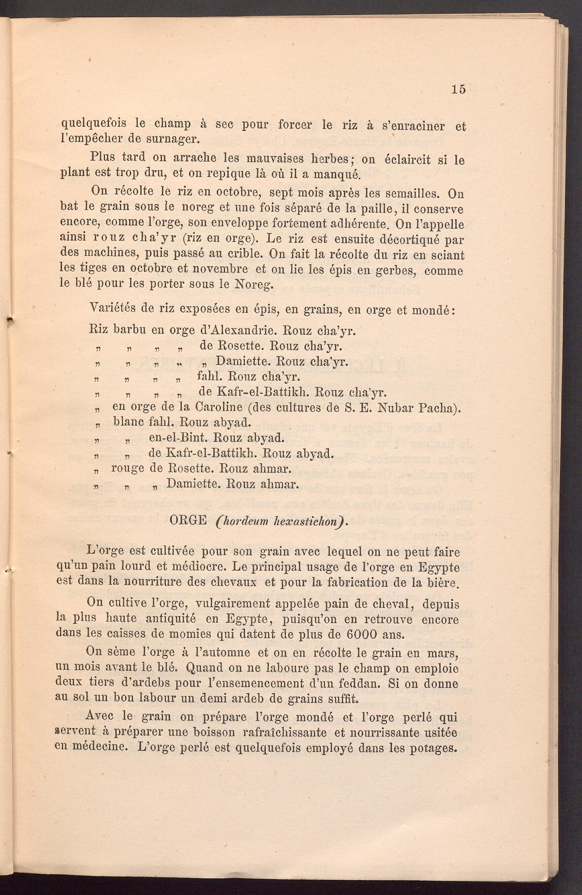 L’orge est cultivee pour son grain avee lequel on ne peilt faire qu’un pain lourd et mediocre. Le principal usage de l’orge en Egypte est dans la nourriture des clievaux et pour la fabrication de la biere.