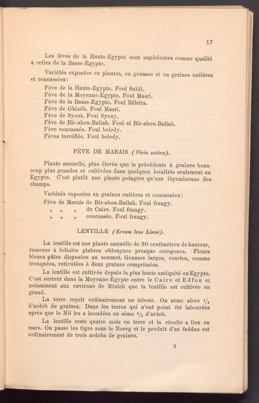 La lentille reste quatre mois en terre et la recolte a lieu en mars. On passe les tiges sous le Noreg et le produit d’un feddan est ordinairement de trois ardebs de graines.