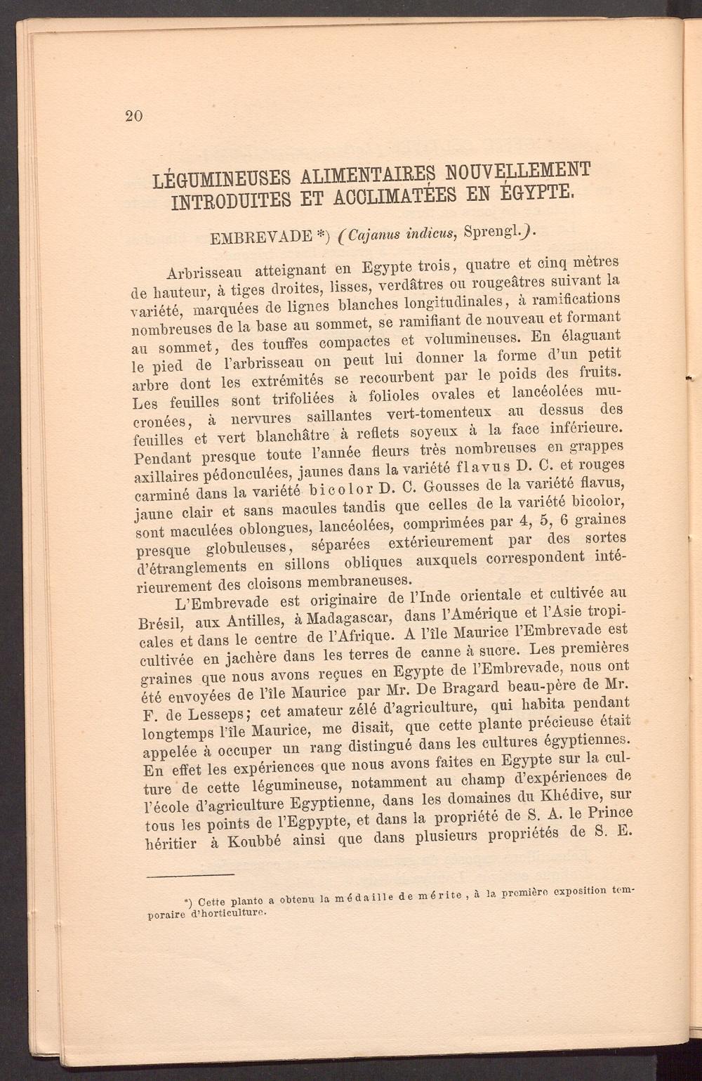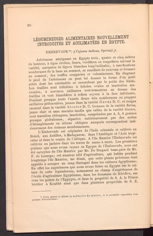 L’Embrevade est originaire de Finde orientale et cultivee au Bresil, aux Antilles, ä Madagascar, dans FAmerique et l’Asie tropi- cales et dans le centre de FAfrique. A File Maurice FEmbrevade est cultivee en jachere dans les terres de canne ä sucre. Les premieres graines que nous avons regues en Egypte de FEmbrevade, nous ont ete euvoyees de File Maurice par Mr. De Bragard beau-pere de Mr. F. de Lesseps; cet amateur zele d’ agriculture, qui habita pendant longtemps File Maurice, me disait, que cette plante precieuse etait appelee ä occuper un rang distingue dans les cultures egyptiennes. En effet les experiences que nous avons faites en Egypte sur la culture de cette legumineuse, notamment au champ d’experiences de Fecole d’agriculture Egyptienne, dans les domaines du Khedive, sur tous les points de FEgpypte, et dans la propriete de S. A. le Prince heritier k Koubbe ainsi que dans plusieurs proprietes de S. E.