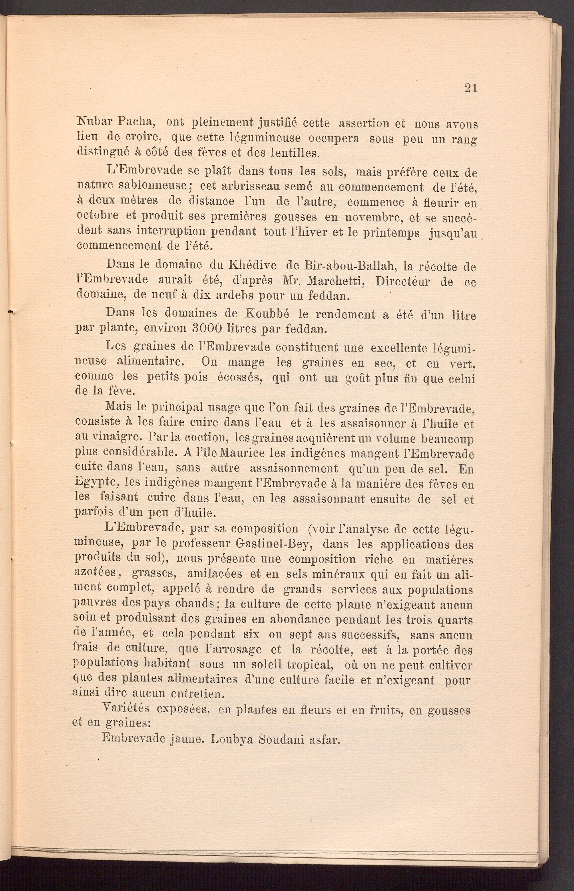 L’Embrevade, par sa composition (voir l’analyse de cette legumineuse, par le professeur Gastinel-Bey, dans les applications des produits du sol), nous presente une composition riche en matieres azotees, grasses, amilacees et en sels mineraux qui en fait un aliment complet, appele ä rendre de grands services aux populations pauvres des pays chauds • la culture de cette plante n’exigeant aucun soin et produisant des graines en abondance pendant les trois quarts de Fannee, et cela pendant six ou sept ans successifs, sans aucun frais de culture, que l’arrosage et la recolte, est ä la portee des populations habitant sous un soleii tropical, oil on ne peut cultiver que des plantes alimentaires d’une culture facile et n’exigeant pour ainsi dire aucun entretien.