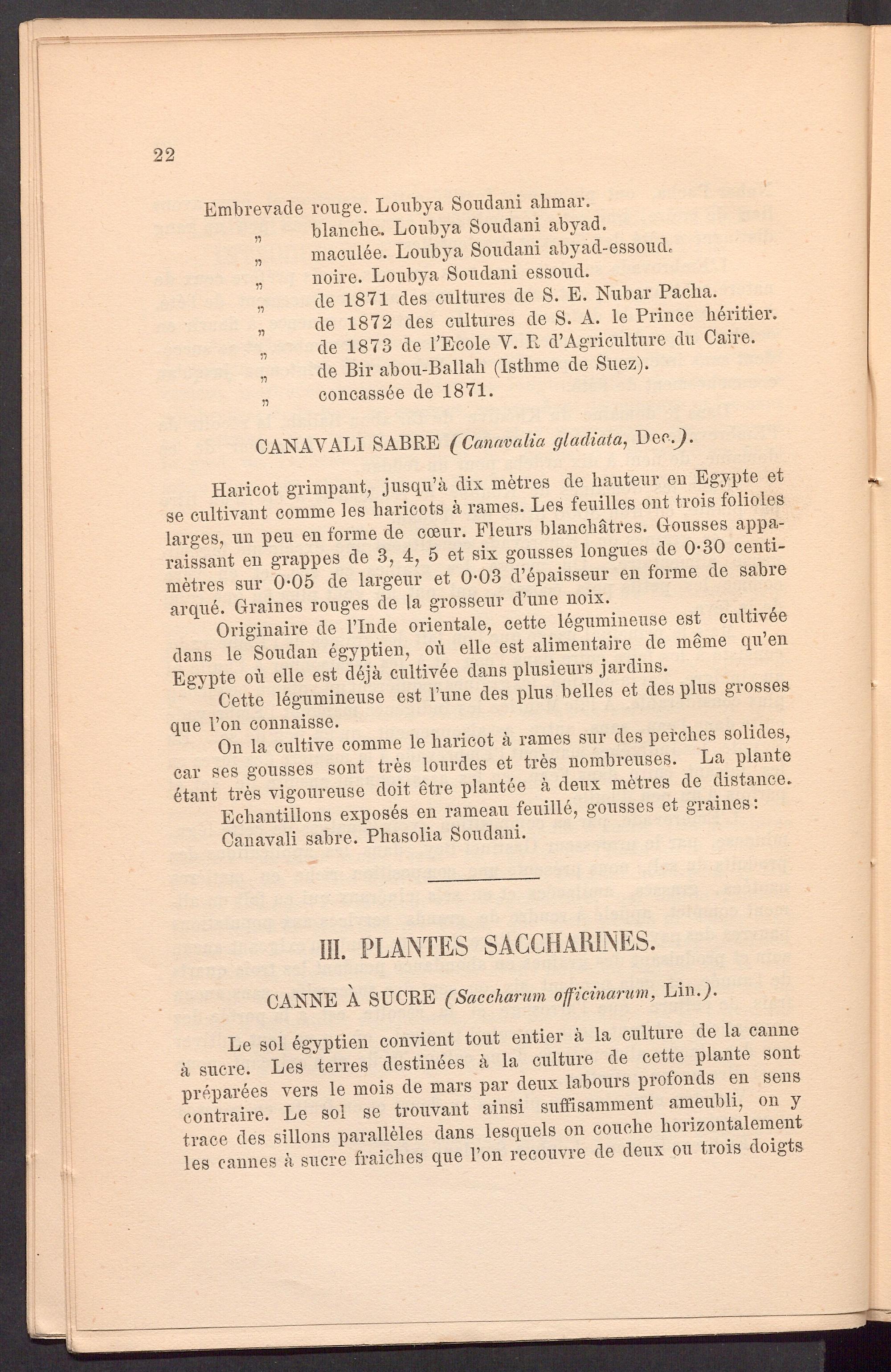 Le sol egyptien convient tout entier ä la culture de la canne ä sucre. Les teures destinees a la culture de cette plante sont preparees vers le mois de mars par deux labours profonds en sens contraire. Le sol se trouvant ainsi suffisamment ameubli, on y trace des sillons paralleles dans lesquels on couehe horizontalement les Cannes ä sucre fraiclies que Fon recouvre de deux ou trois doigts