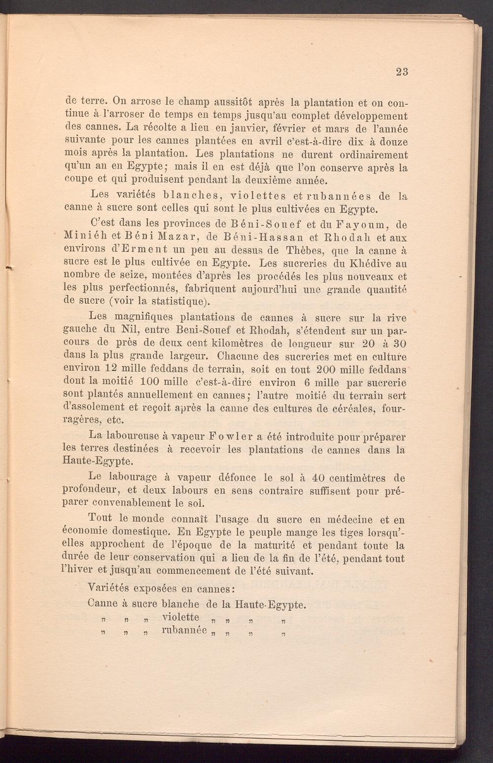 C’est dans les provinces de B eni-S ou ef et du Fayoum, de MiniehetBeniMazar, de Beni-Hassan et Rhodah et aux environs d’Erment un peu au dessus de Thebes, que la canne ä sucre est le plus cultivee en Egypte. Les sucreries du Khedive au nombre de seize, montees d’apres les procedes les plus nouveaux et les plus perfectionnes, fabriquent aujourd’hui une grande quantite de sucre (voir la statistique).