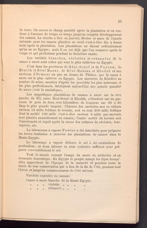 de terre. On arrose le champ aussitot apres la plantation et on continue k rarroser de temps en temps jusqu’au complet developpement des Cannes. La recolte a lieu en janvier, fevrier et mars de l’annee suivante pour les Cannes plantees en avril c’est-a-dire dix k douze mois apres la plantation. Les plantations ne durent ordinairement qu’un an en Egypte; mais il en est dejä que l’on conserve apres la coupe et qui produisent pendant la deuxieme annee.