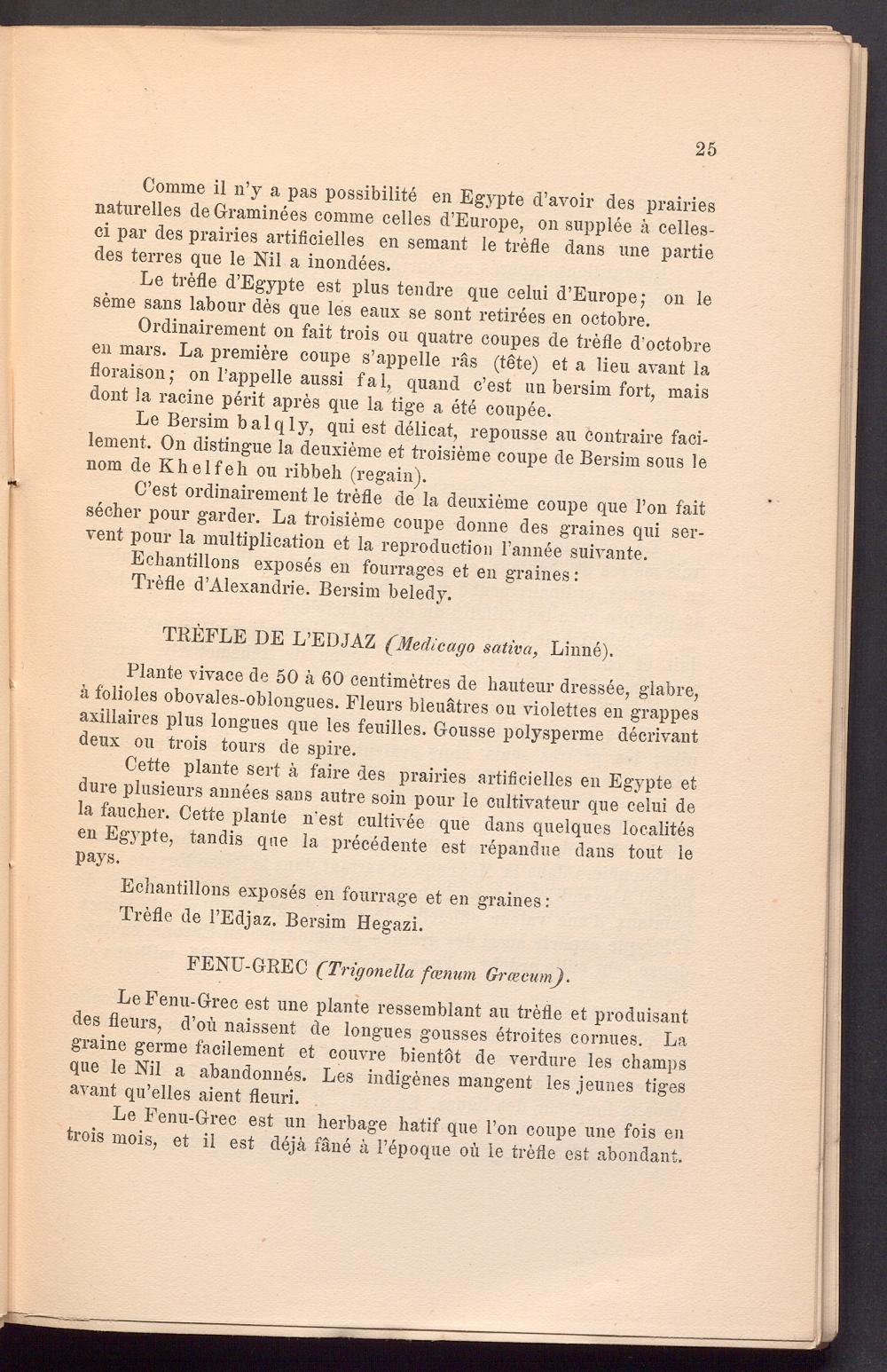 Comme il n’y a pas possibility en Egypte d’avoir des prairies naturelles deGraminees comme celles d’Europe, on supplee ä celles- ci par des prairies artificielles en semant le trefle dans une partie des terres que le Ml a inondees.