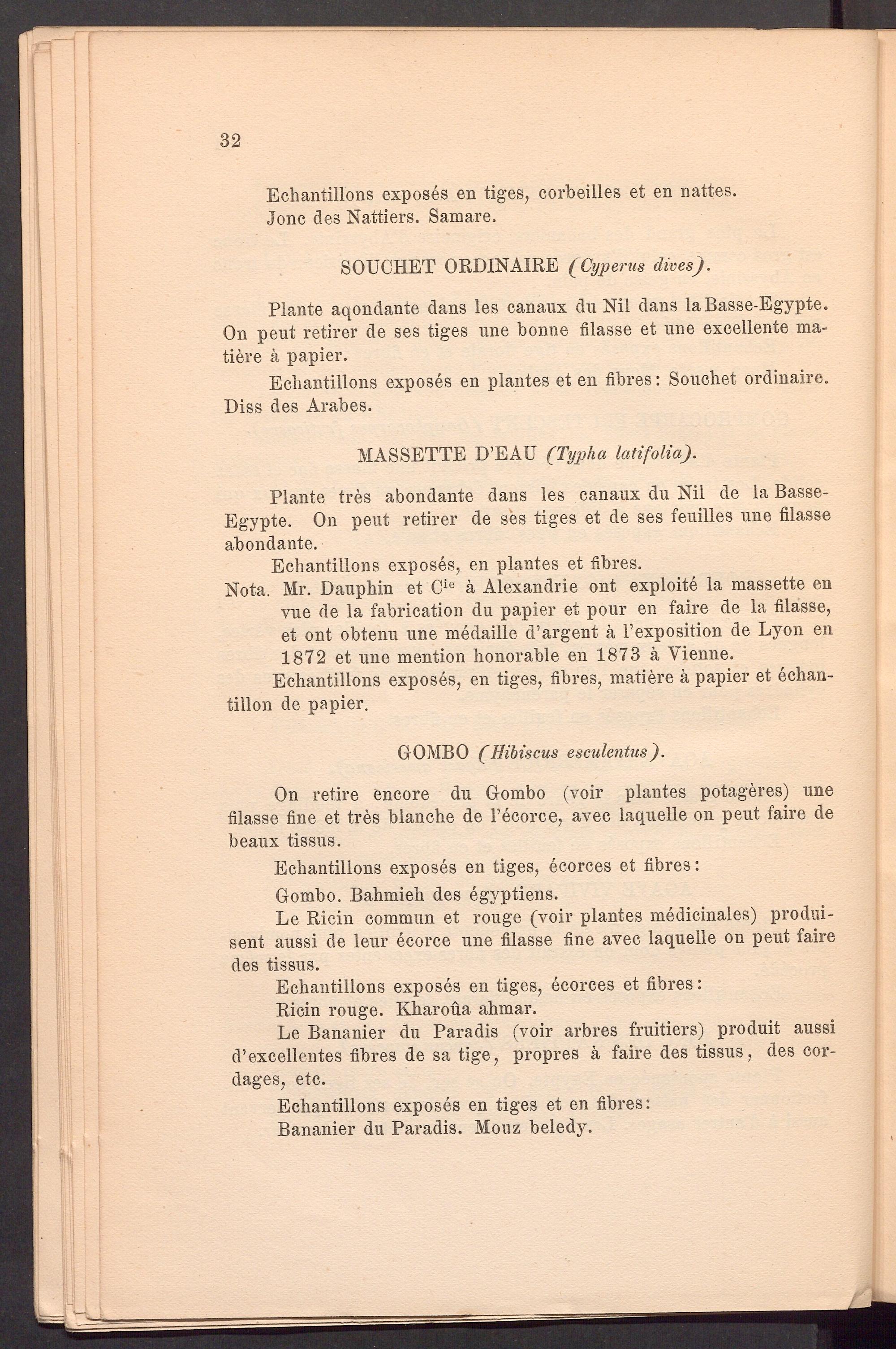 Nota. Mr. Dauphin et C ie ä Alexandrie ont exploite la massette en vue de la fabrication du papier et pour en faire de la filasse, et ont obtenu une medaille cP argent ä l’exposition de Lyon en 1872 et une mention honorable en 1873 ä Vienne. Echantillons exposes, en tiges, fibres, matiere ä papier et echan- tillon de papier.