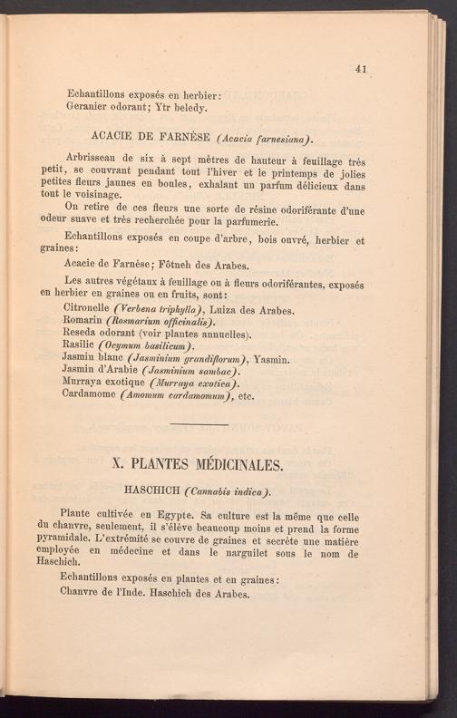 Plante cultivee en Egypte. Sa culture est la meme que celle du chanvre, seulement, il s’eleve beaucoup moins et prend la forme pyramidale. L’extremite se couvre de graines et secrete une matiere employee en medecine et dans le narguilet sous le nom de Haschich.