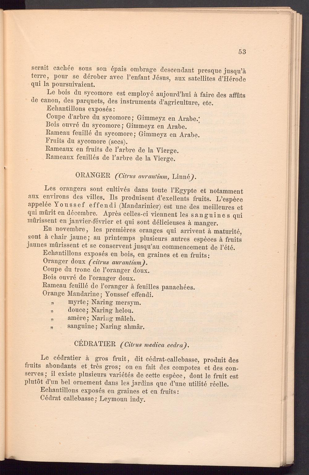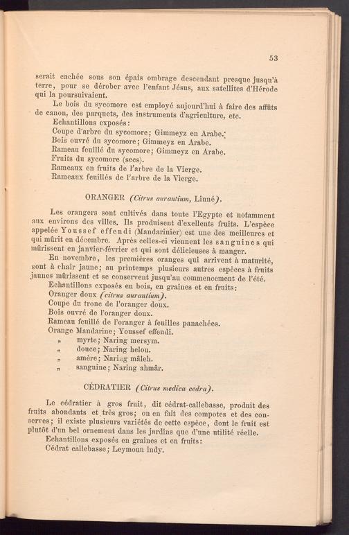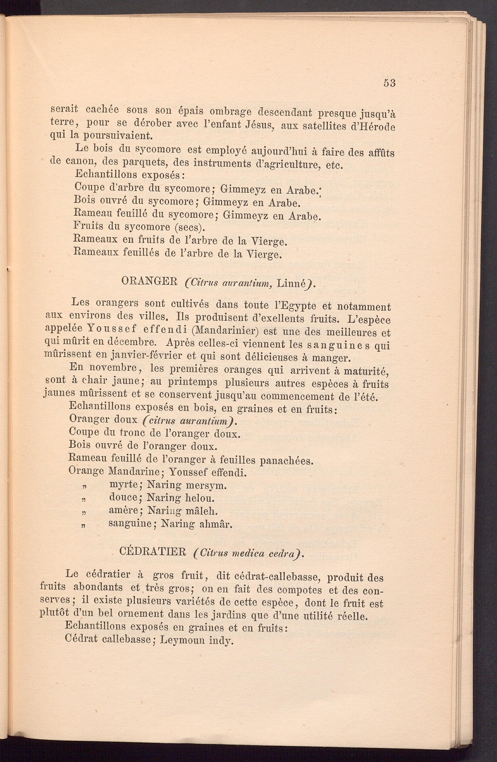 Les orangers sont cultives dans toute l’Egypte et notamment aux environs des villes. Ils produisent d’exellents fruits. L’espece appelee Youssef effendi (Mandarinier) est une des meilleures et qui mürit en decembre. Apres celles-ci viennent les sanguine s qui mürissent en janvier-fevrier et qui sont delicieuses ä manger.