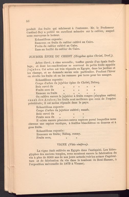Arbre eleve, k cime arrondie, toutfue gar nie d’un epais feuil- lage, et dont les ramifications se couvrent de petits fruits appeles J u j u b e s. Cet arbre est tres repandu en Egypte, dans les jardins et les champs, et ne demaude aucun soin particulier. Pendant l’hiver on recolte les fruits oü on les ramasse par terre pour les manger.