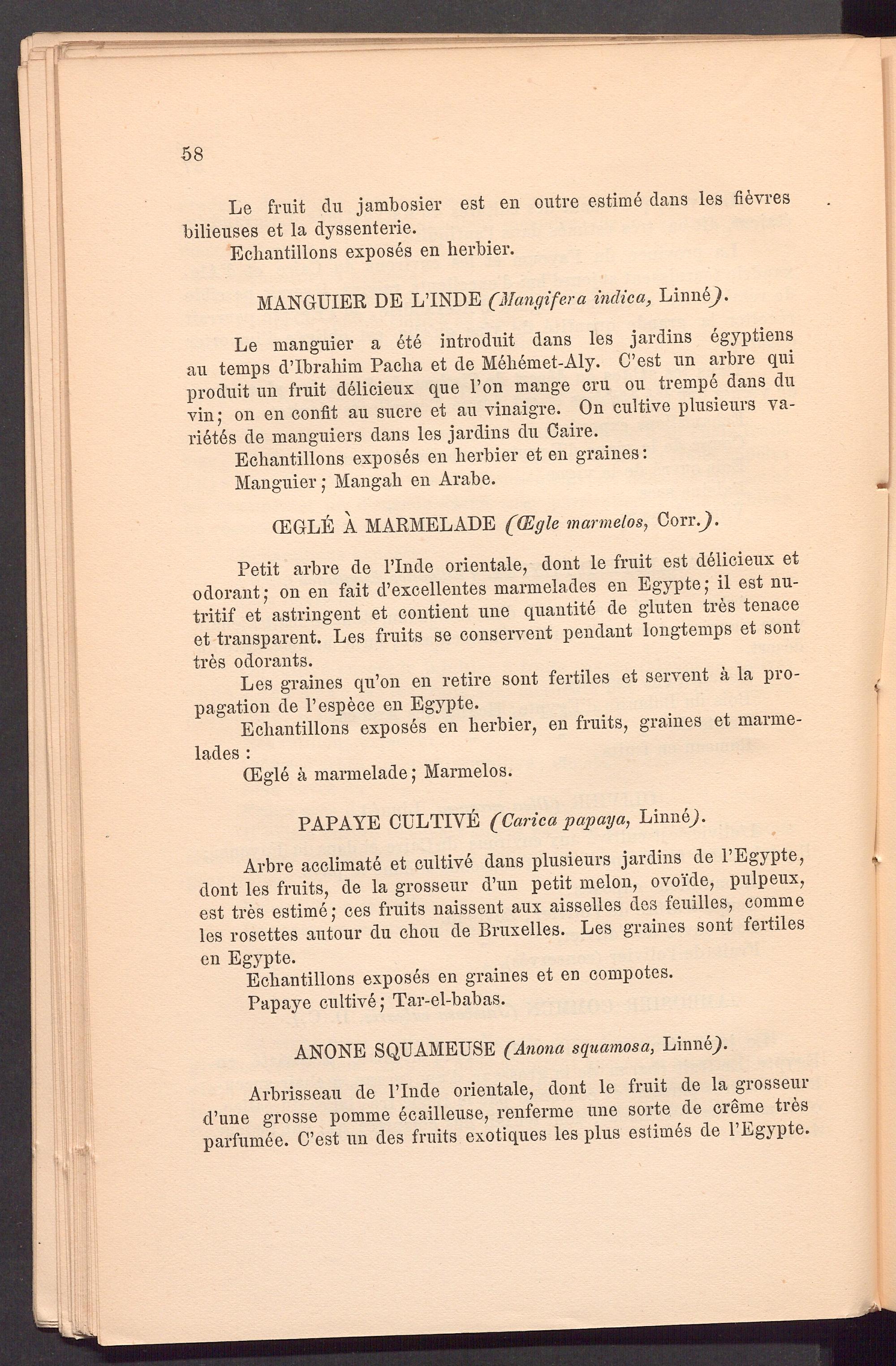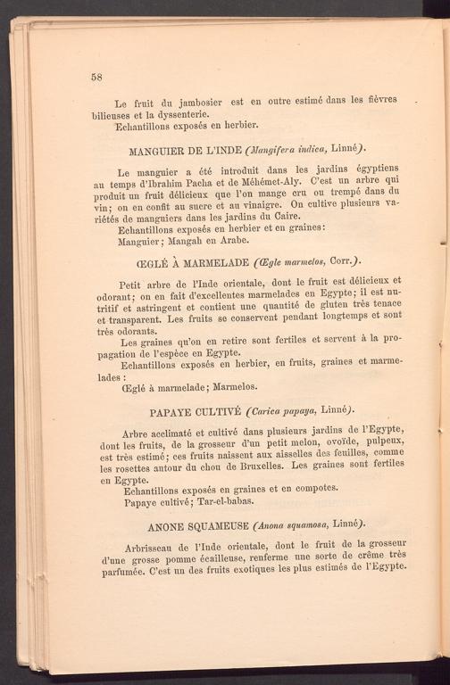 Le manguier a ete introduit dans les jardins egyptiens au temps d’Ibraliim Paclia et de Meliemet-Aly. C’est un arbre qui produit un fruit delicieux que Ton mange cru ou trempe dans du vin; on en confit au sucre et au vinaigre. On cultive plusieurs Varietes de manguiers dans les jardins du Caire.