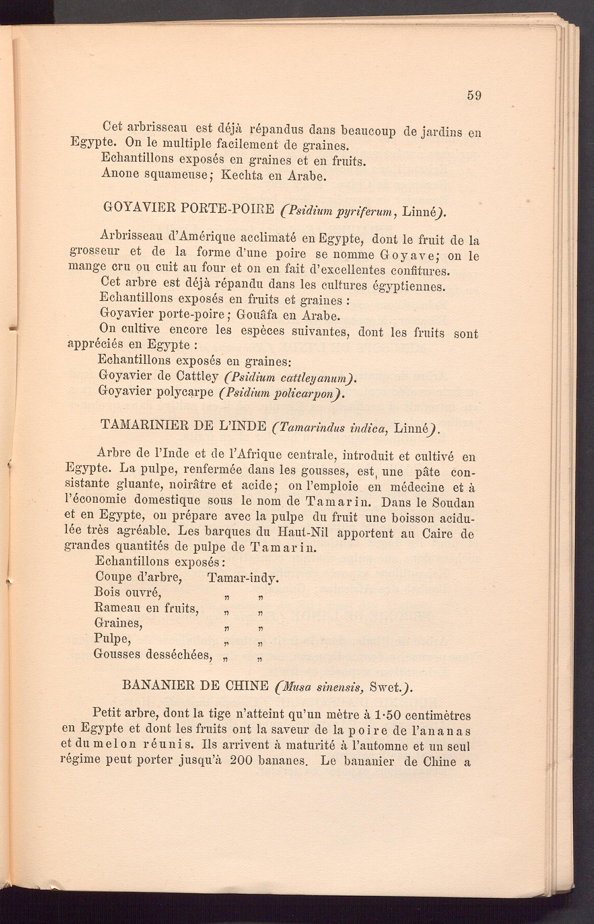 Arbre de Finde et de l’Afrique centrale, introduit et cultive en Egypte. La pulpe, renfermee dans les gousses, est, une päte con- sistante gluante, noirätre et acide; on l’emploie en medecine et ä l’economie domestique sous le nom de Tamar in. Dans le Soudan et en Egypte, on prepare avec la pulpe du fruit une boisson acidu- lee tres agreable. Les barques du Haut-Nil apportent au Caire de grandes quantites de pulpe de Tamar in.