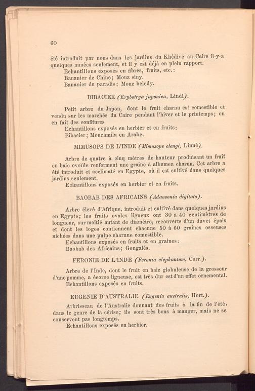 Arbre eleve d’Afrique, introduit et cultive dans quelques jardins en Egypte; les fruits ovales ligneux ont 30 k 40 centimetres de longueur, sur moitie autant de diametre, recouverts d’un duvet epais et dont les loges eontiennent chacune 50 ä 60 graines osseuses nichees dans une pulpe charnue comestible.