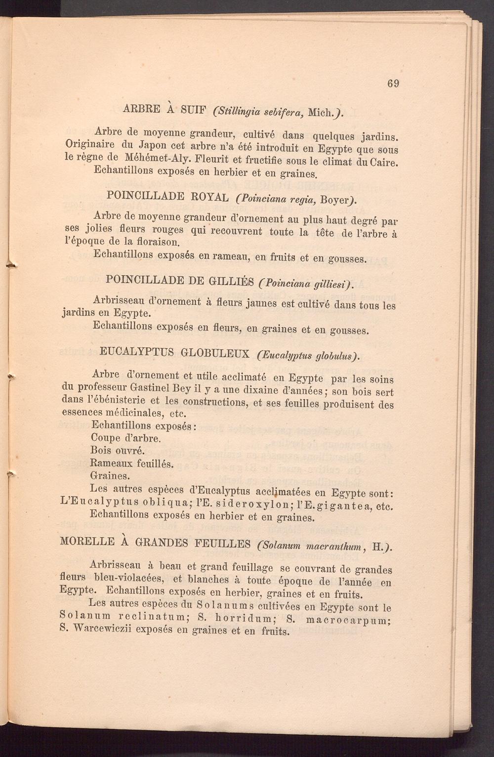 Arbre d’ornement et utile acclimate en Egypte par les soins du professeur Gastinel Bey il y a une dixaine d’annees j son bois sert dans l’ebenisterie et les constructions, et ses feuilles produisent des essences medicinales, etc.