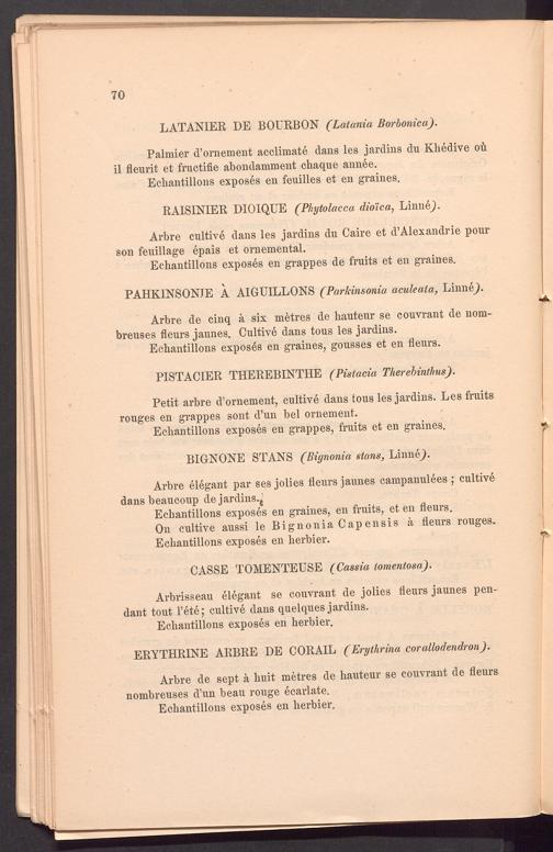 Palmier d’ornement acclimate dans les jardins du Khedive od il fleurit et fructifie abondamment chaqne annee.