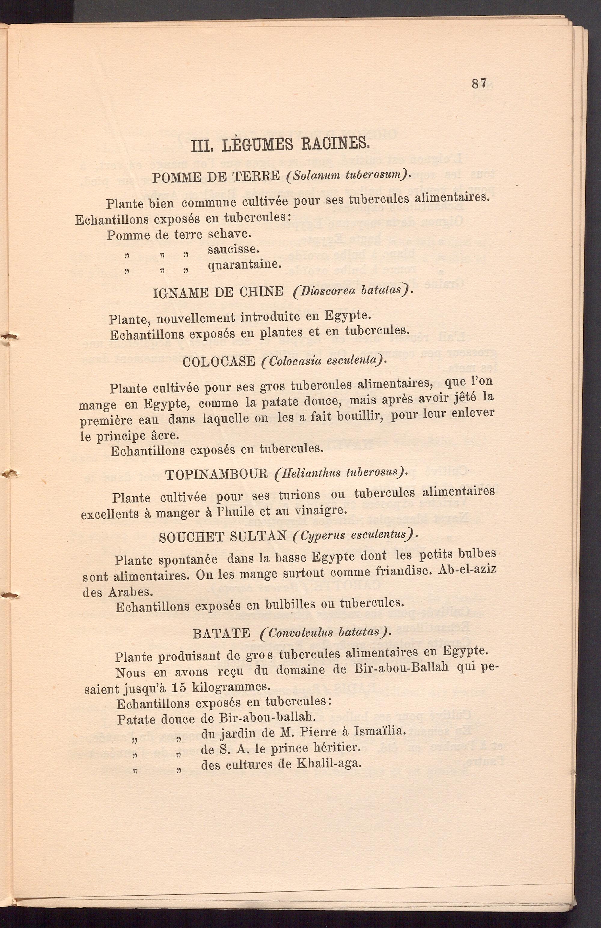 Plante cultivee pour ses gros tubercules alimentaires, que l’on mange en Egypte, comme la patate douce, mais apres avoir jete la premiere eau dans laquelle on les a fait bouillir, pour leur enlever le principe acre.