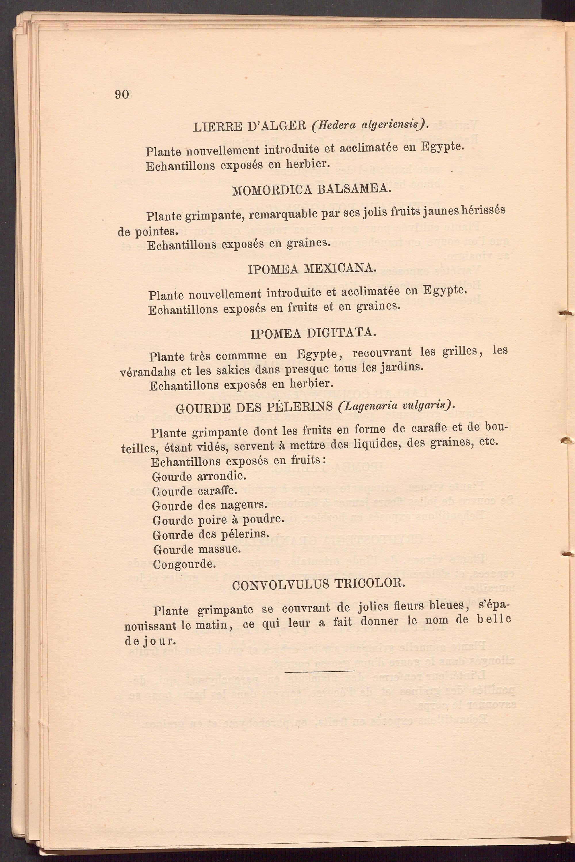 Plante grimpante dont les fruits en forme de caraffe et de bou- teilles, etant vides, servent ä mettre des liquides, des graines, etc. Echantillons exposes en fruits: