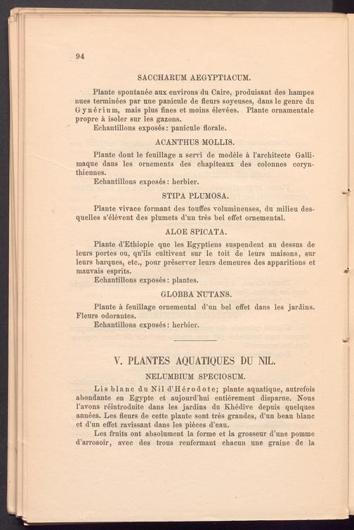 Lis blanc du Nil d’Herodote; plante aquatique, autrefois abondante en Egypte et aujourd’hui entierement disparue. Nous l’avons reintroduite dans les jardins du Khedive depuis quelques annees. Les fleurs de cette plante sont tres grandes, d’un beau blanc et d’un effet ravissant dans les pieces d’eau.