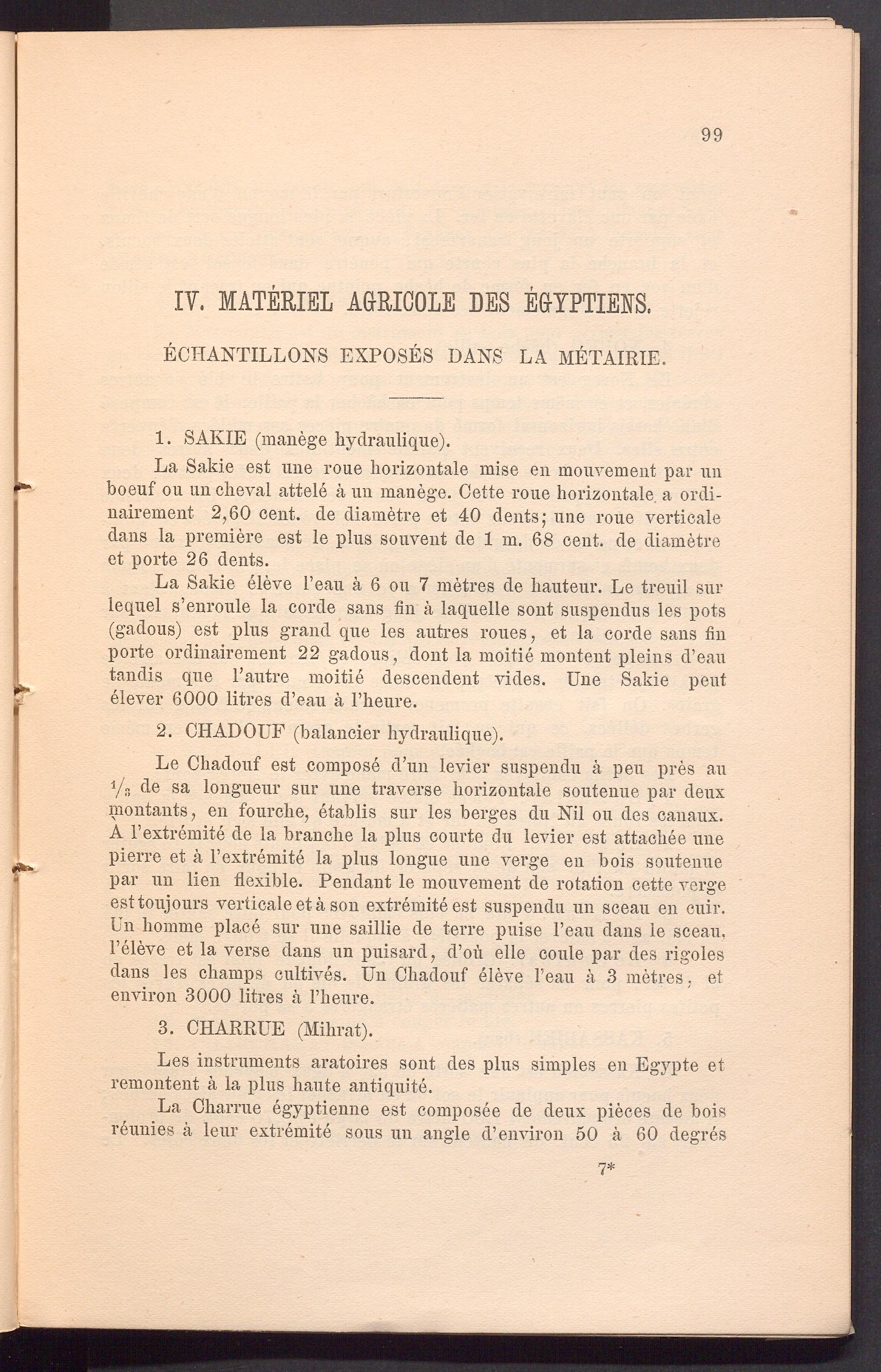 La Sakie eleve l’eau ä 6 ou 7 metres de hauteur. Le treuil sur lequel s’enroule la corde sans fin ä laquelle sont suspendus les pots (gadous) est plus grand que les autres roues, et la corde sans fin porte ordinairement 22 gadous, dont la moitie montent pleins d’eau tandis que Pautre moitie descendent vides. Une Sakie pent elever 6000 litres d’eau k l’heure.