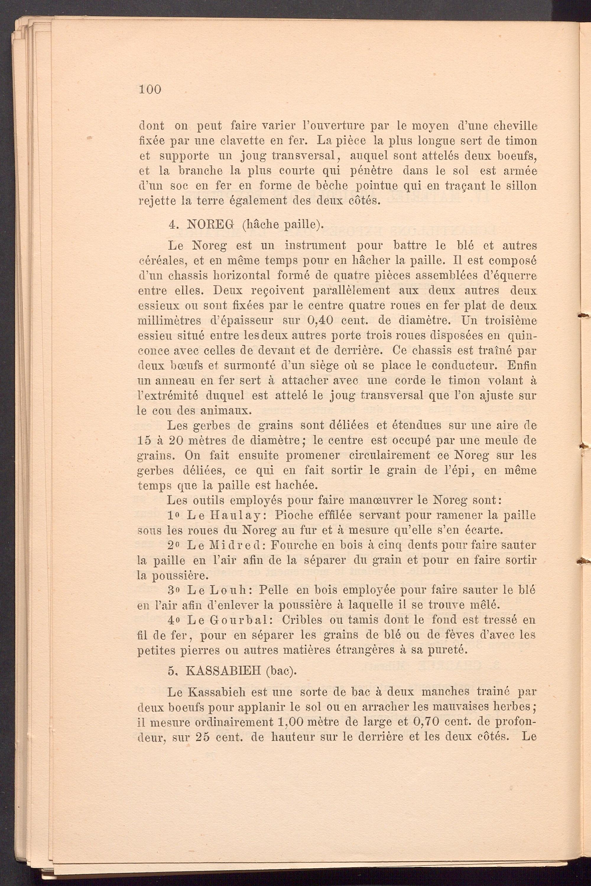 Le Kassabieh est une sorte de bac a deux manches traine par deux boeufs pour applanir le sol ou en arracher les mauvaises herbes * il mesure ordinairement 1,00 metre de large et 0,70 cent, de profon- deur, sur 25 cent, de hauteur sur le derriere et les deux cotes. Le