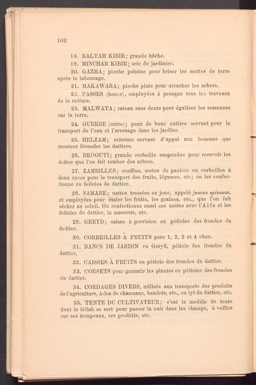 26. BEOOUTI; grande corbeille suspendue pour recevoir les dattes que Ton fait tomber des arbres.