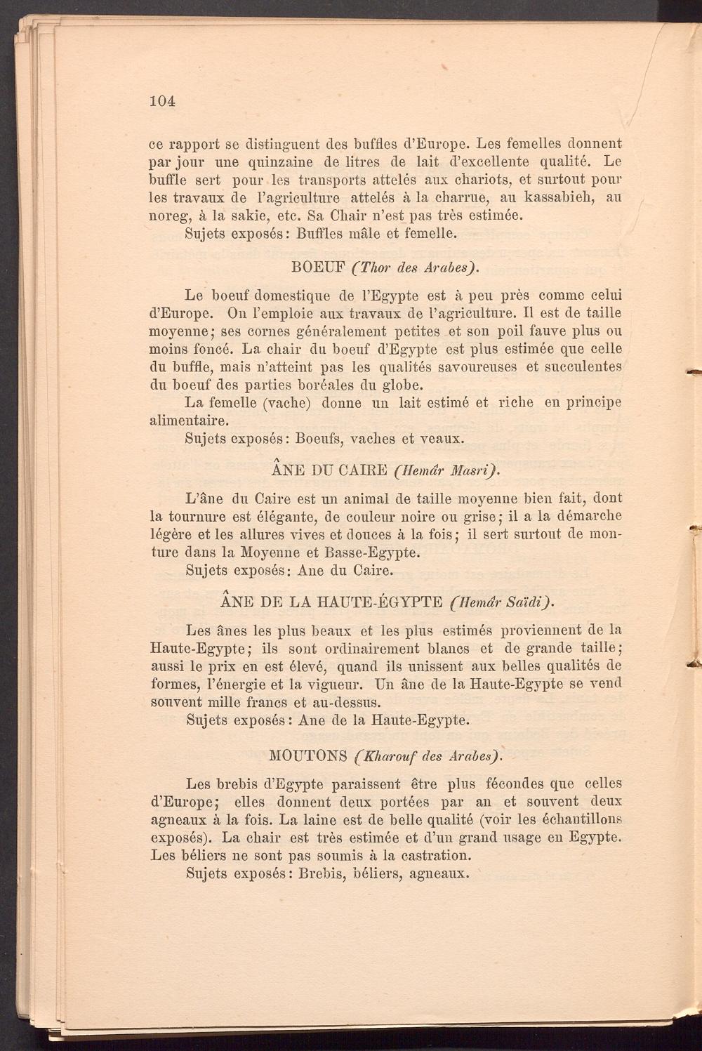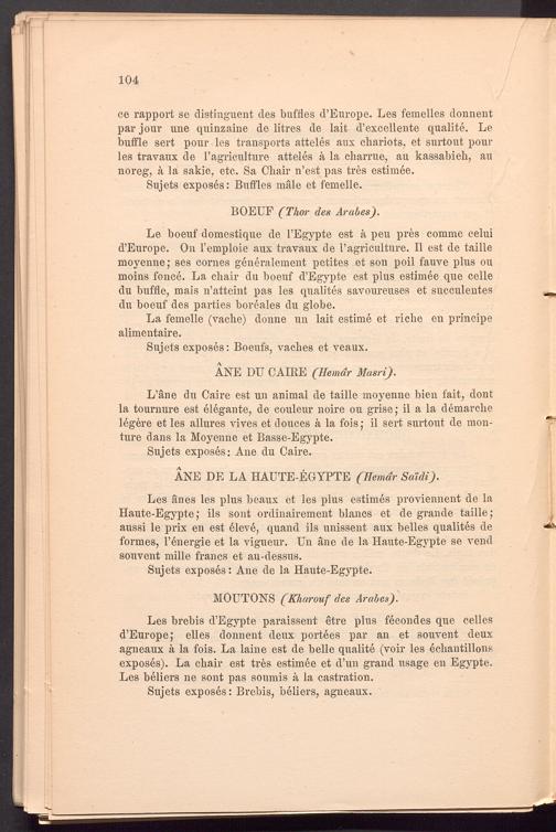 Les brebis d’Egypte paraissent etre plus fecondes que celles d’Europe; eiles donnent deux portees par an et souvent deux agneaux ä la fois. La laine est de belle qualite (voir les echantillons exposes). La chair est tres estimee et d’un grand usage en Egypte. Les beliers ne sont pas sounds k la castration.