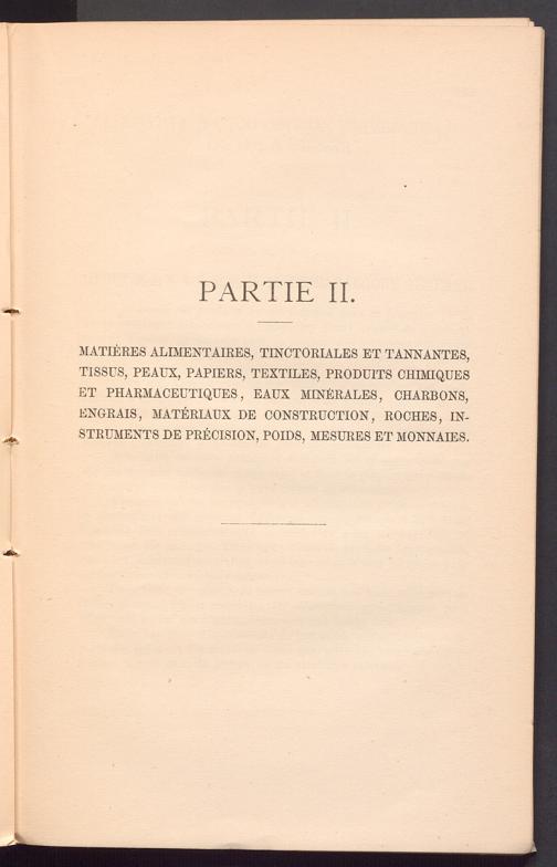 MATIERES ALIMENTAIRES, TINCTORIALES ET TANN ANTES, TISSÜS, PEAUX, PAPIERS, TEXTILES, PRODUKTS CHIMIQUES ET PHARMACEUTIQUES, EAÜX MINERALES, CHARBONS, ENGRAIS, MATERIAUX DE CONSTRUCTION, ROCHES, INSTRUMENTS DE PRECISION, POIDS, MESURES ET MONNAIES.