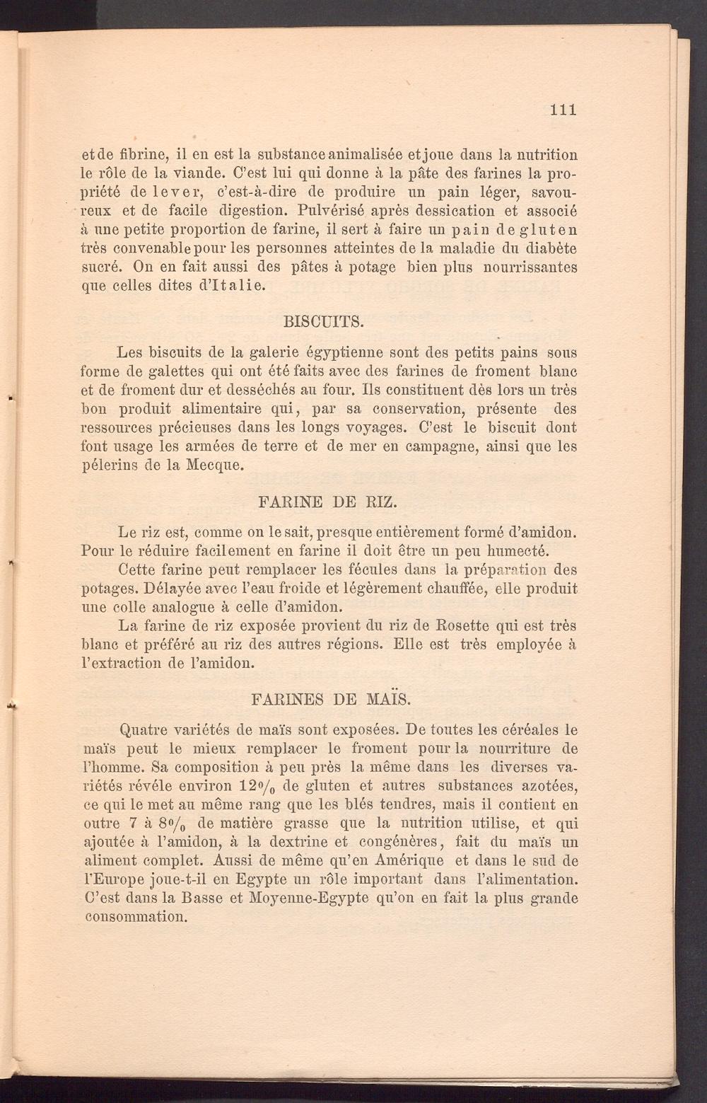 Les biscuits de la galerie egyptienne sont des petits pains sous forme de galettes qui ont ete faits avec des farines de froment blanc et de froment dur et desseelies au four. Ils constituent des lors un tres bon produit alimentaire qui, par sa conservation, presente des ressources precieuses dans les longs voyages. C’est le biscuit dont font usage les armees de terre et de mer en Campagne, ainsi que les pelerins de la Mecque.