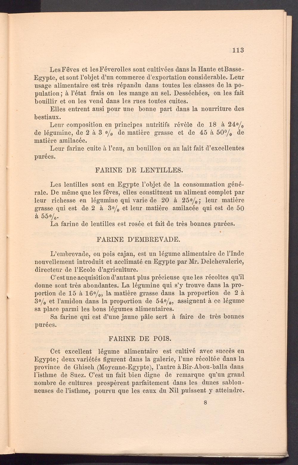 LesFeves et lesFeverolles sont cultivees clans la Haute et Basse- Egypte, et sont l’objet d’un commerce d’exportation considerable. Leur usage alimentaire est tres repandu dans toutes les classes de la population; ä l’etat frais on les mange au sei. Dessecliees, on les fait bouillir et on les vend dans les rues toutes cuites.