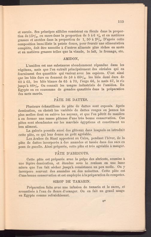 L’amidon est une substancse abondamment repandue dans les vegetaux, mais que l’on extrait principalement des cereales qui en fournissent des quantites qui varient avec les especes. C’est ainsi que les bles durs en donnent de 58 k 60%, les bles demi durs de 60 ä 65, les bles blancs de 65 ä 70, Forge 66, le mai's 67, le riz jusqu’ä 88o/ 0 . On connait les usages industriels de l’amidon. En Egypte on en consomme de grandes quantites dans la preparation des mets sucres.