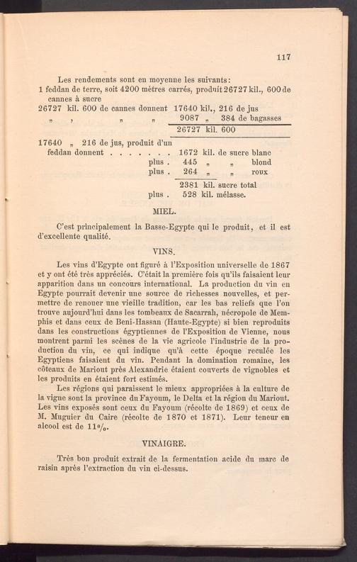 Les regions qui paraissent le mieux appropriees ä la culture de la vigne sont la province duFayoum, le Delta et la region du Mariout. Les vins exposes sont ceux du Fayoum (recolte de 1869) et ceux de M. Muguier du Caire (recolte de 1870 et 1871). Leur teneur en alcool est de 11%.