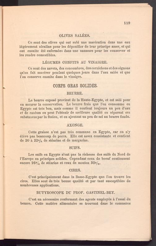 Le beurre expose provient de la Haute-Egypte, et est sale pour en assurer la conservation. Le beurre frais que l’on consomme en Egypte est tres bon, mais comme il contient toujours un peu d’eau et de caseum on peut l’obtenir de meilleure qualite en separant ces substances par la fusion, et en ajoutant un peu de sei au beurre fondu.