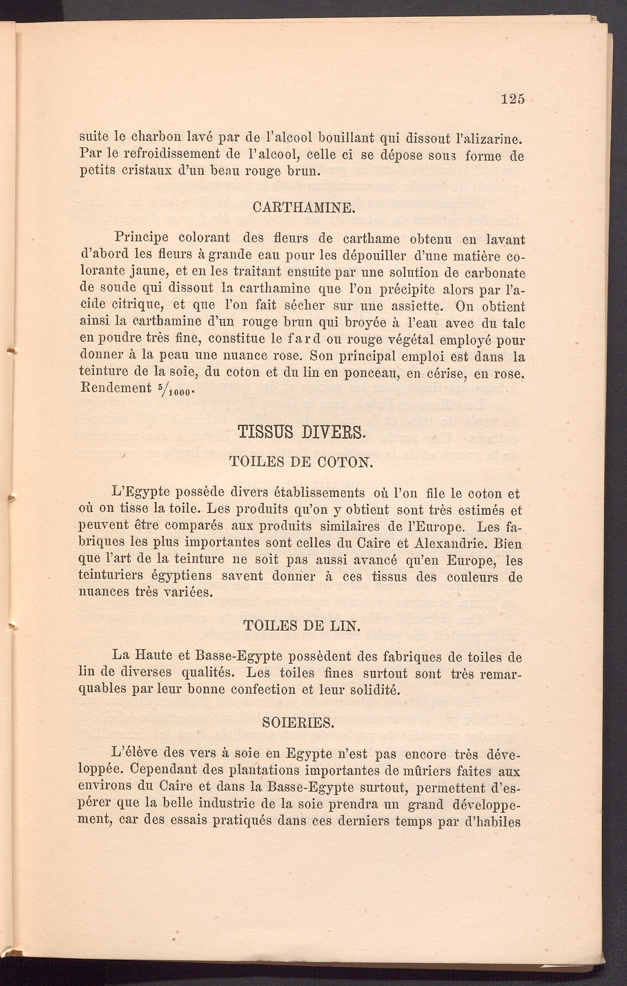 L’Egypte possede divers etablissements ou Ton file le coton et oü on tisse la toile. Les produits qu’on y obtient sont tres estimes et peuvent etre compares aux produits similaires de TEurope. Les fa- briques les plus importantes sont celles du Caire et Alexandrie. Bien que l’art de la teinture ne soit pas aussi avance qu’en Europe, les teinturiers dgyptiens savent donner ä ces tissus des couleurs de nuances tres variees.