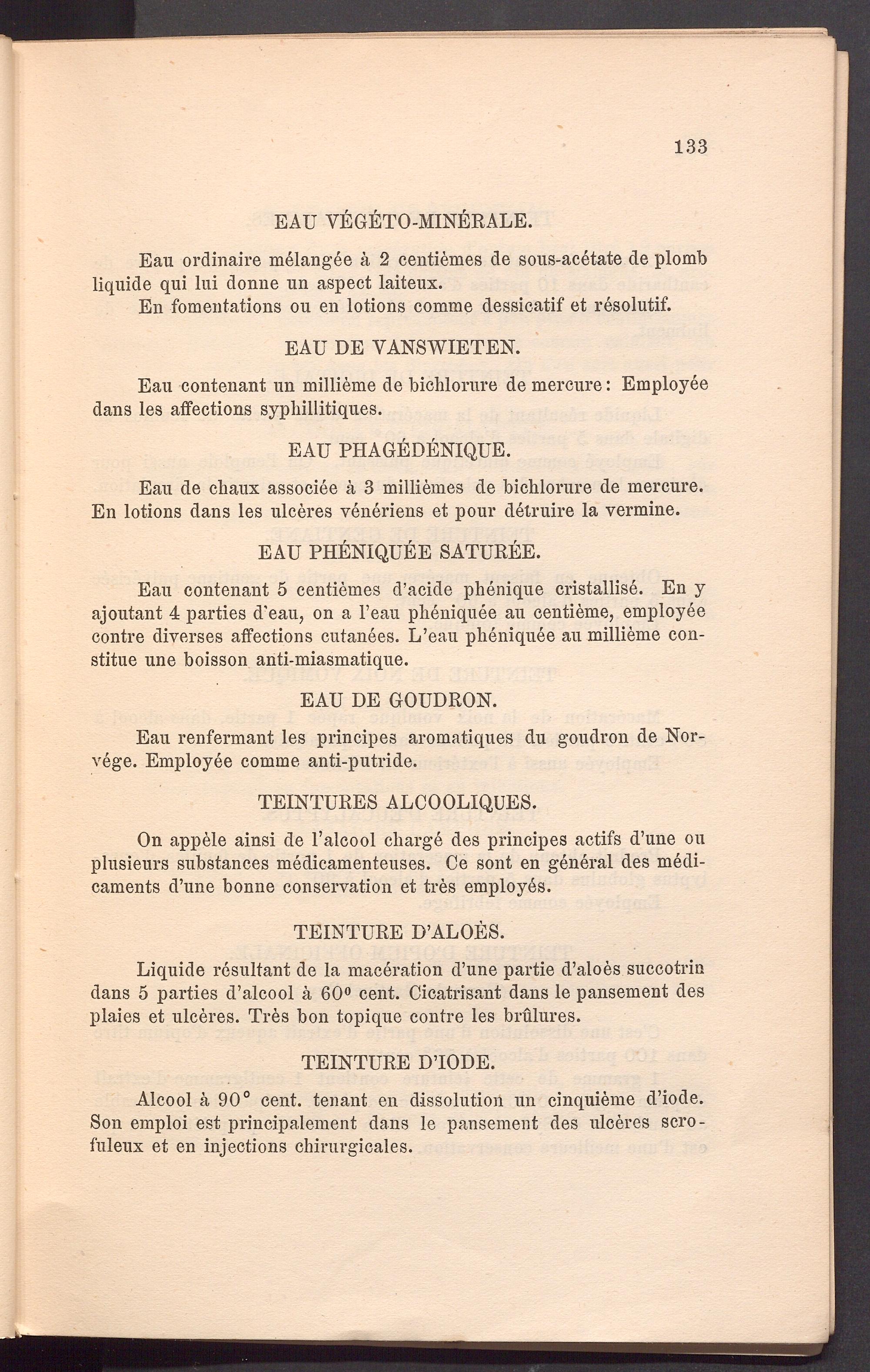 Alcool ä 90° cent, tenant en dissolution un cinquieme d’iode. Son emploi est principalement dans le pansement des ulceres scro- fuleux et en injections chirurgicales.