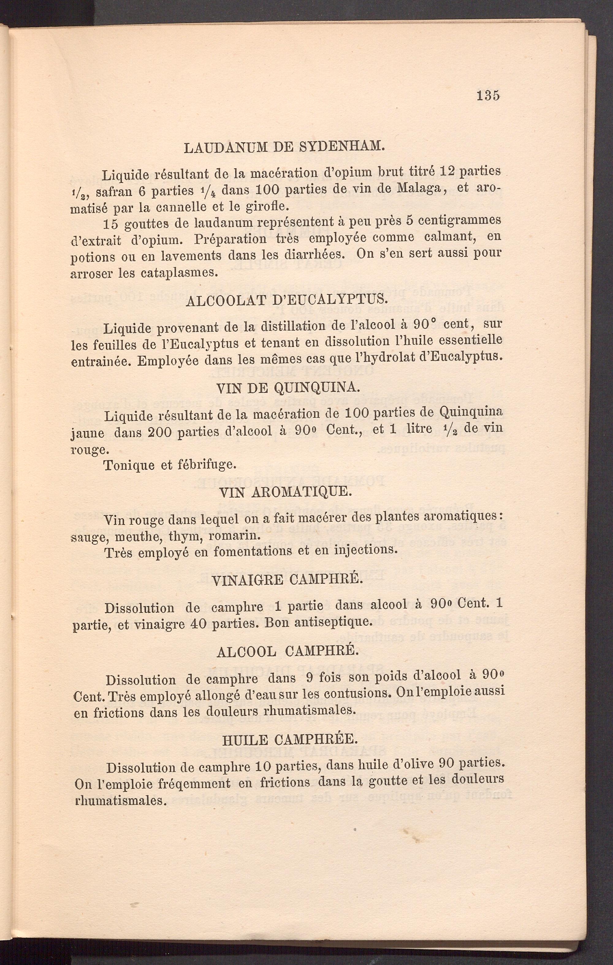 15 gouttes de laudanum represented a, peu pres 5 centigrammes d’extrait d’opium. Preparation tres employee comme calmant, en potions ou en lavements dans les diarrhees. On s’en sert aussi pour arroser les cataplasmes.