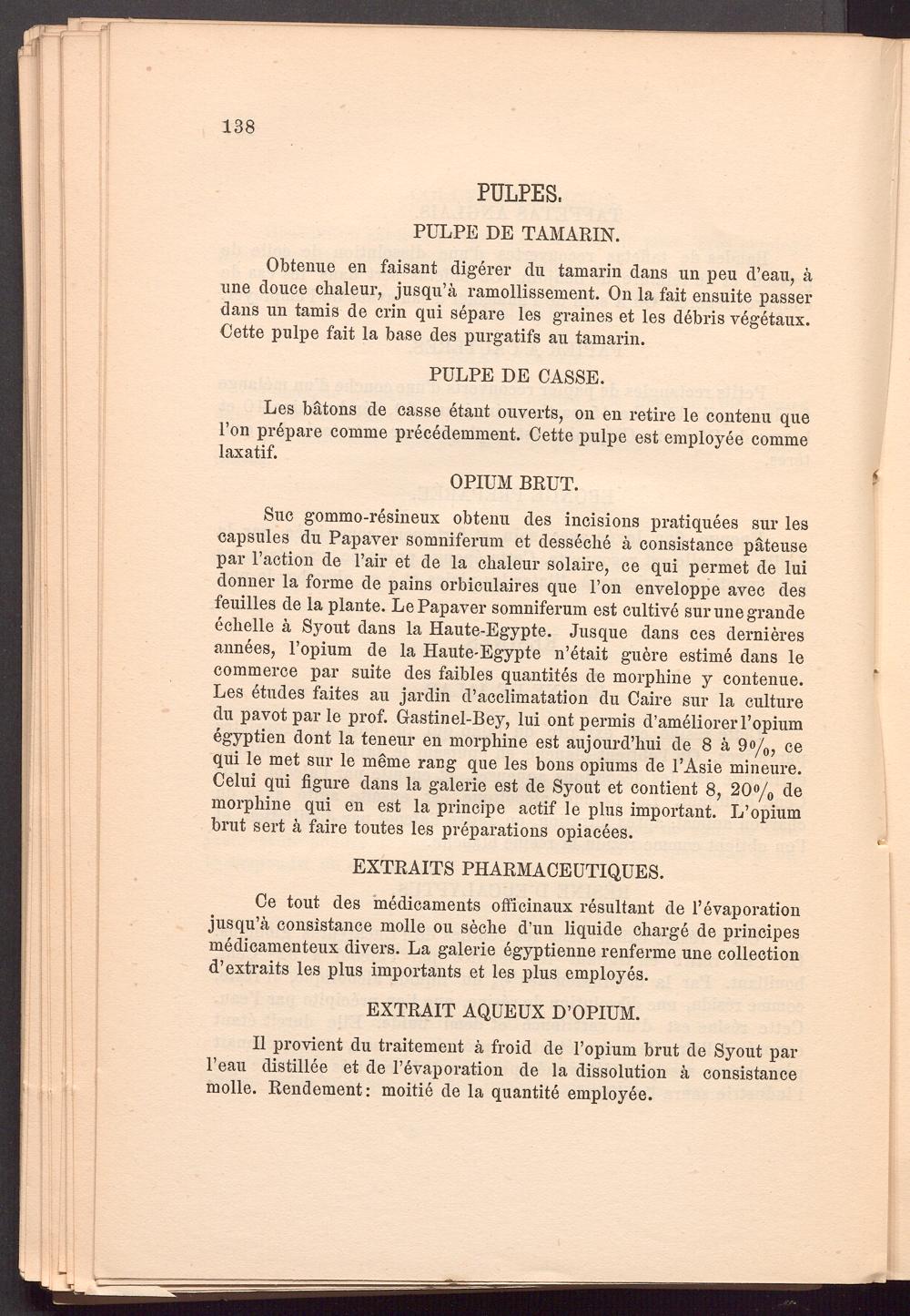 Sue gommo-resineux obtenu des incisions pratiquees sur les capsules du Papaver somniferum et desseche ä consistance päteuse par l’action de Pair et de la chaleur solaire, ce qui permet de lui donner la forme de pains orbiculaires que l’on enveloppe avec des feuilles de la plante. Le Papaver somniferum est cultive sur une grande echelle ä Syout dans la Haute-Egypte. Jusque dans ces dernieres annees, l’opium de la Haute-Egypte n’etait guere estime dans le commerce par suite des faibles quantites de morphine y contenue. Les etudes faites au jardin d’acclimatation du Caire sur la culture du pavot par le prof. Gastinel-Bey, lui ont permis d’ameliorerPopium egyptien dont la teneur en morphine est aujourd’hui de 8 ä 9%, ce qui le met sur le meme rang que les bons opiums de l’Asie min eure. Celui qui figure dans la galerie est de Syout et contient 8, 20°/ 0 de morphine qui en est la principe actif le plus important. L’opium brut sert ä faire toutes les preparations opiacees.