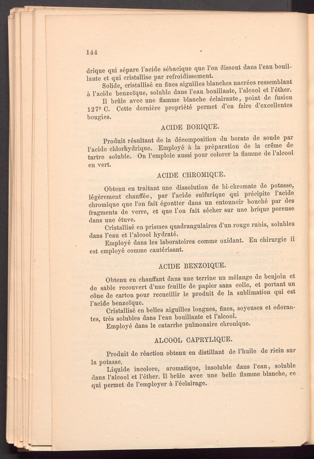 Obtenu en chauffant dans une terrine un melange de benjoin et de sable recouvert d’une feuille de papier sans colle, et portant un cone de carton pour recueillir le produit de la sublimation qui est l’acide benzoi’que.