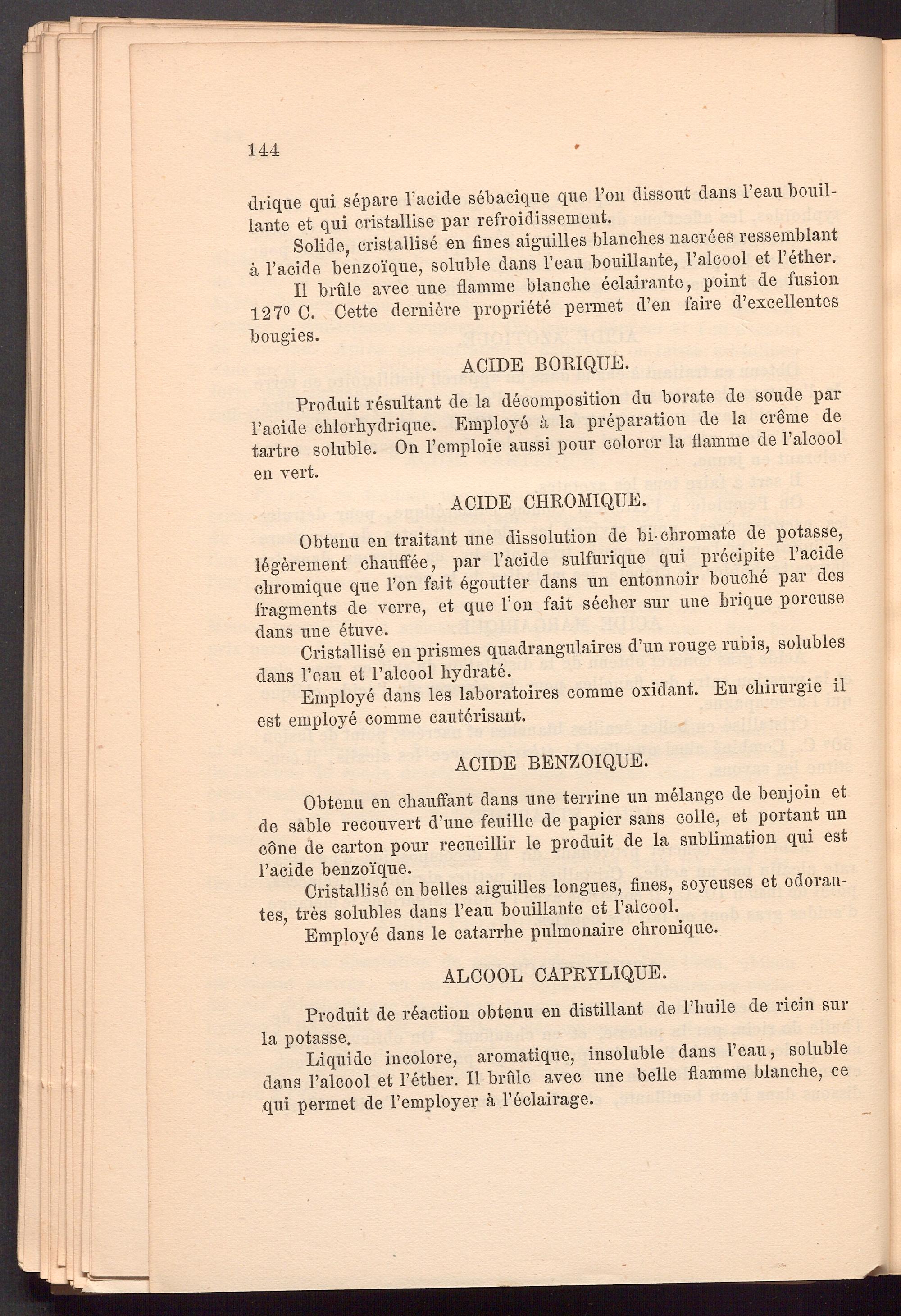 II brule avec une flamme blanche eclairante, point de fusion 127° C. Cette derniere propriete pennet d’en faire d’excellentes bougies.