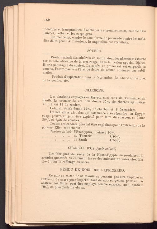 Produit extrait des minerals de soufre, dont des gisements existent sur la cöte africaine de la mer rouge, dans la region appelee Djebel- Kibrit (montagne du soufre). Le soufre en provenant est en partie en canons, l’autre partie ä l’etat de fleurs de soufre obtenues par sublimation.