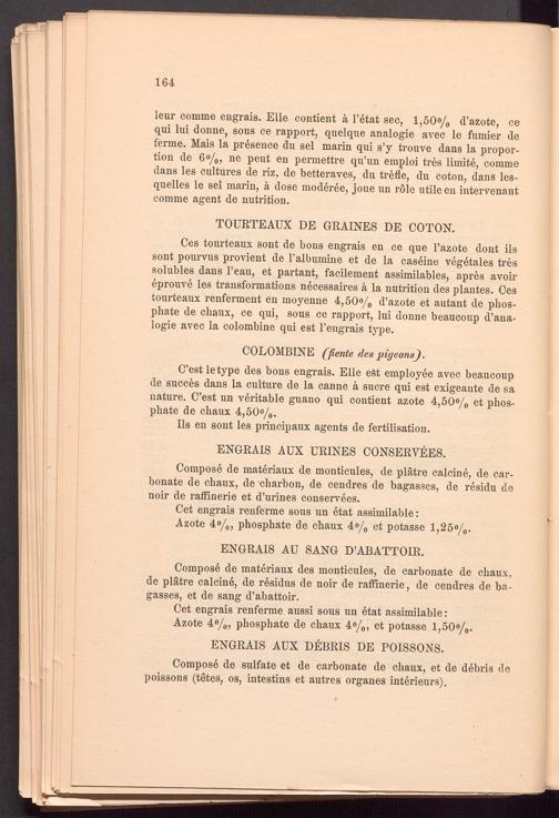 Ces tourteaux sont de bons engrais en ce que l’azote dont ils sont pourvus provient de ralbumine et de la caseine vegetales tres solubles dans l’eau, et partant, facilement assimilables, apres avoir eprouve les transformations necessaires ä la nutrition des plantes. Ces tourteaux renferment en moyenne 4,50o/ 0 d’azote et autant de phosphate de chaux, ce qui, sous ce rapport, lui donne beaucoup d’ana- logie avec la colombine qui est l’engrais type.