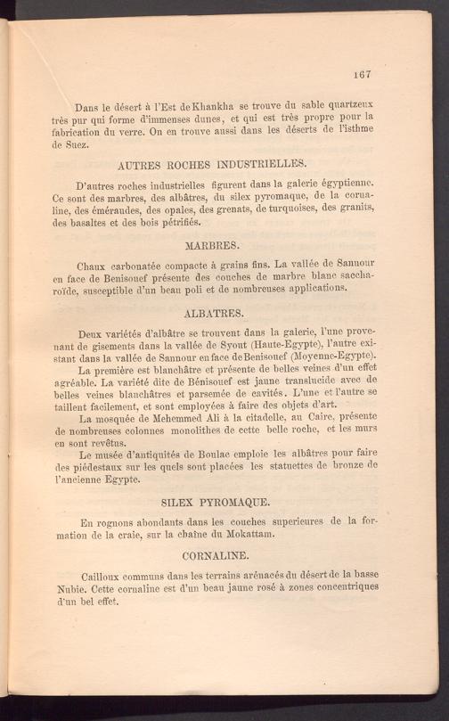 D’autres roches industrielles figurent dans la galerie egyptienne. Ce sont des marbres, des albätres, du silex pyromaque, de la corua- line, des emeraudes, des opales, des grenats, de turquoises, des granits, des basaltes et des bois petrifies.