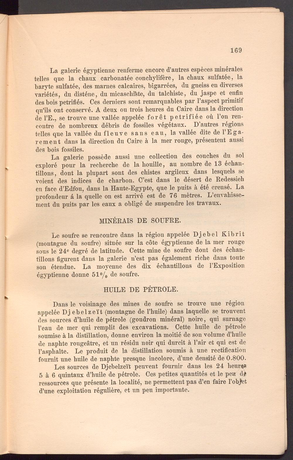 Le soufre se rencontre dans la region appelee Djebel Kibrit (montagne du soufre) situee sur la cote egyptienne de la mer rouge sous le 24 e degre de latitude. Cette mine de soufre dont des echan- tillons figurent dans la galerie n’est pas egalement riche dans toute son etendue. La moyenne des dix echantillons de 1’Exposition egyptienne donne 51°/ 0 de soufre.