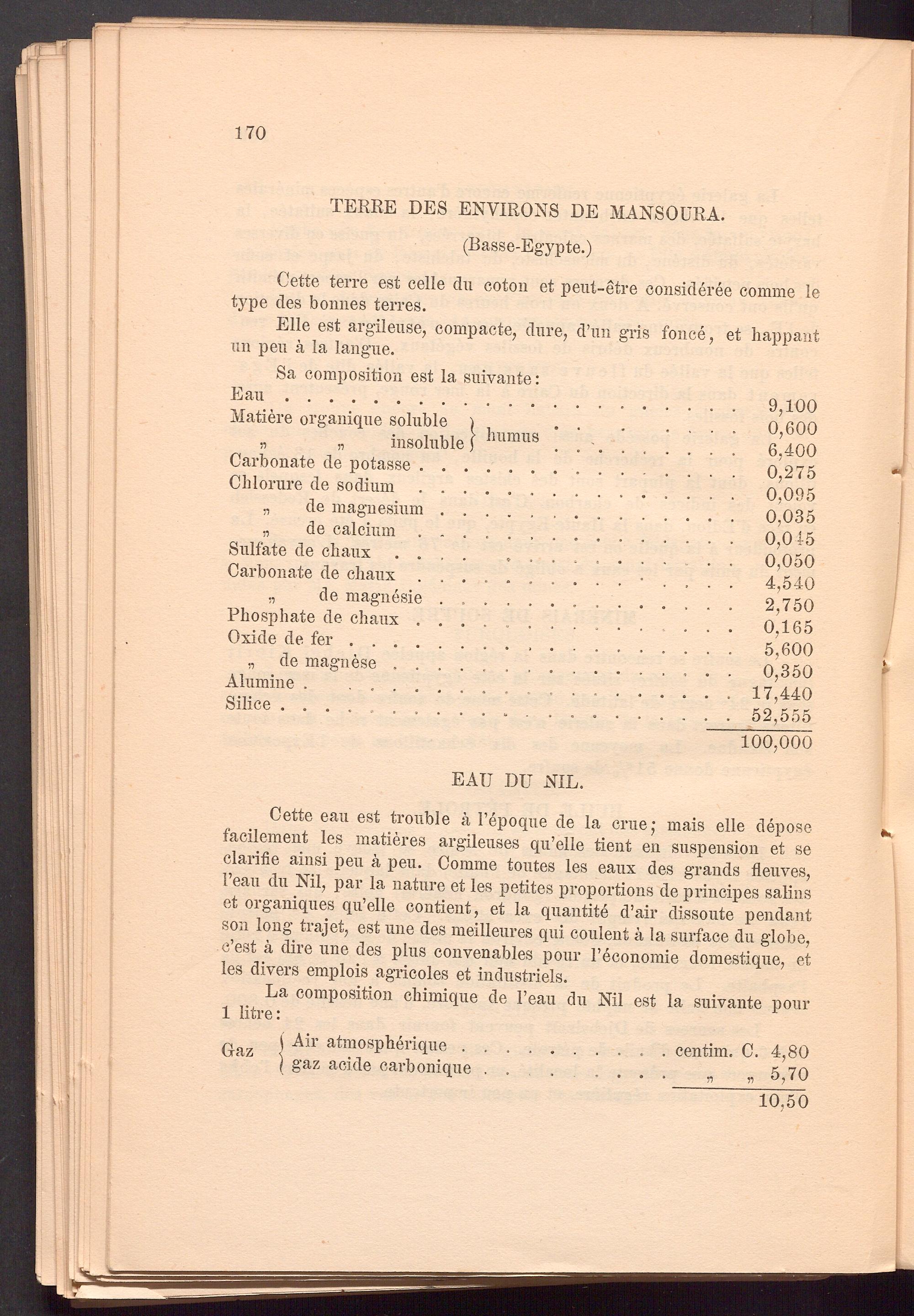 Cette eau est trouble k l’epoque de la erne • mais eile depose facilement les matieres argileuses qu’elle tient en suspension et se clarifie ainsi peu k peu. Comme toutes les eaux des grands fleuves, Feau du Nil, par la nature et les petites proportions de principes salins et organiques qu’elle contient, et la quantite d’air dissoute pendant son long trajet, est une des meilleures qui coulent ä la surface du globe, e’est k dire une des plus convenables pour l’economie domestique, et les divers emplois agricoles et industriels.