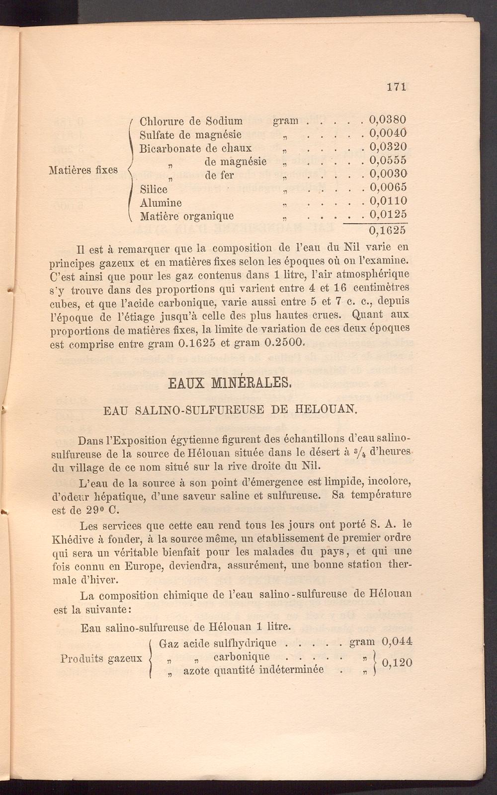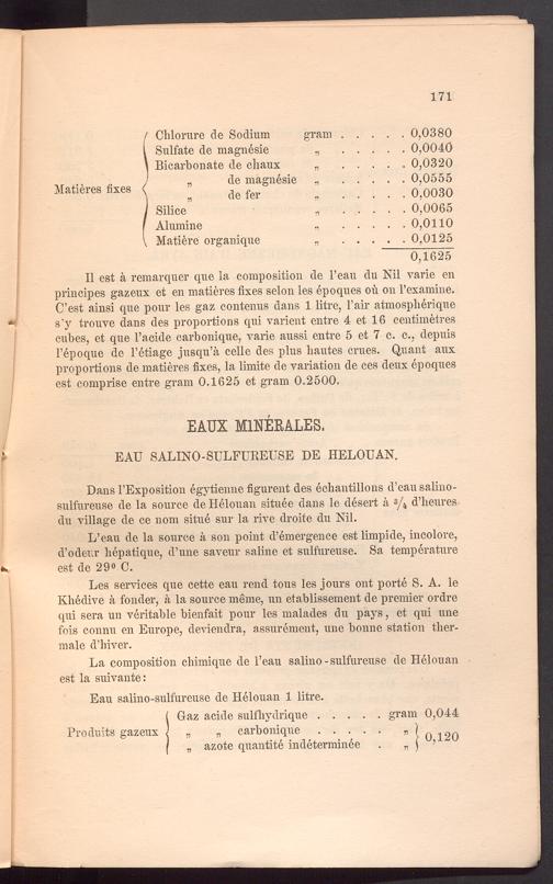 Dans FExposition egytienne figurent des echantillons d’eausalino- sulfureuse de la source de Helouan situee dans le desert ä s / 4 d’lieures du village de ce nom situe sur la rive droite du Nil.