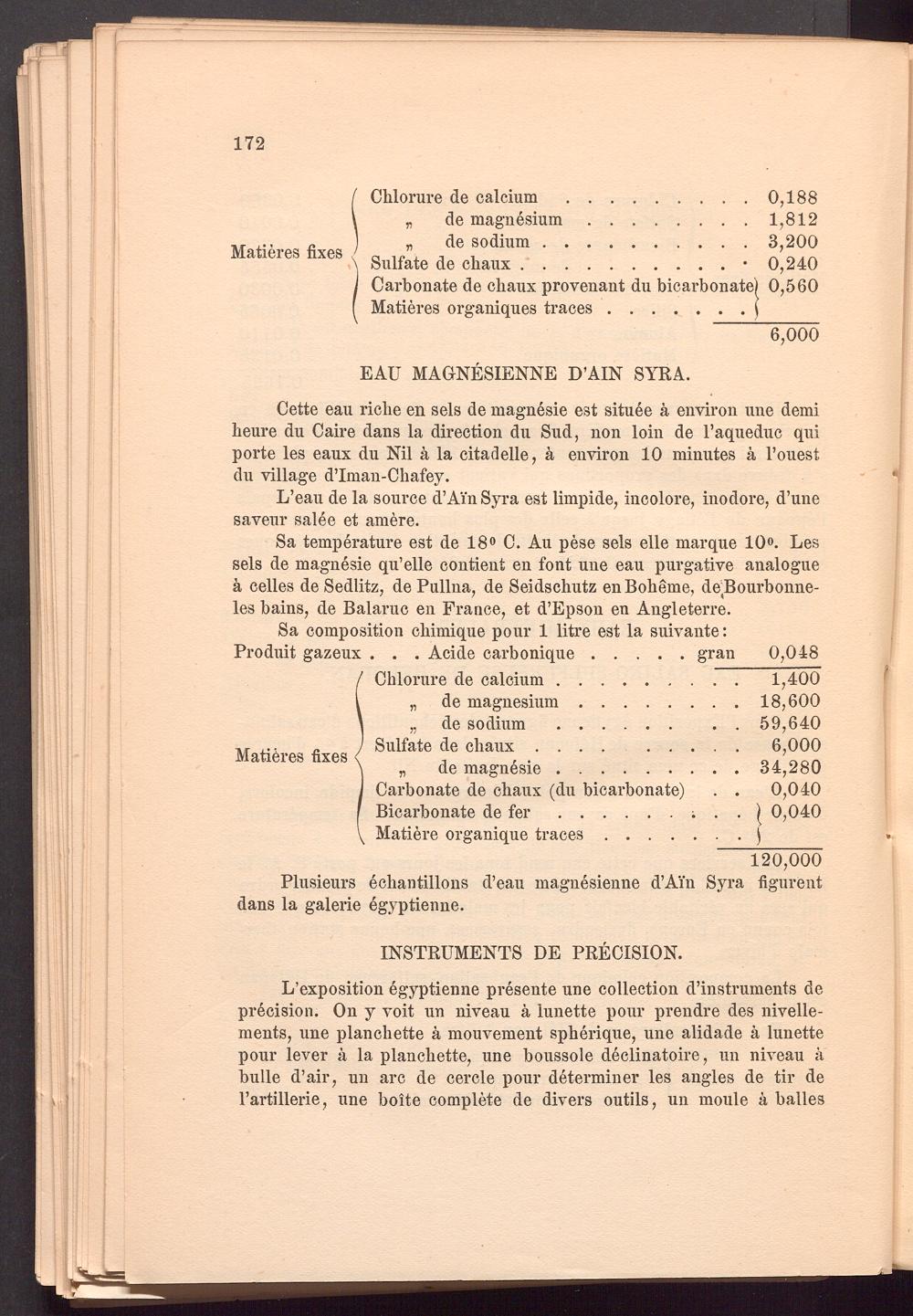 Cette eau riebe en sels de magnesie est situee ä environ une demi heure du Caire dans la direction du Sud, non loin de l’aqueduc qui porte les eaux du Nil ä la citadelle, k environ 10 minutes k holiest du village d’Iman-Chafey.
