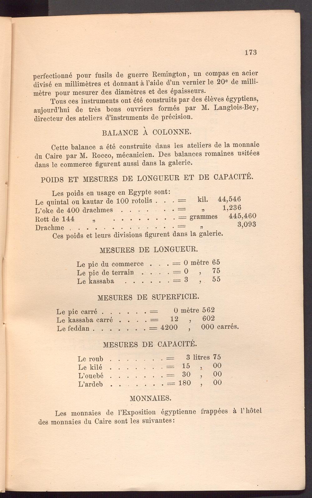 Cette balance a ete construite dans les ateliers de la monnaie du Caire par M. Rocco, mecanicien. Des balances romaines usitees dans le commerce figurent aussi dans la galerie.