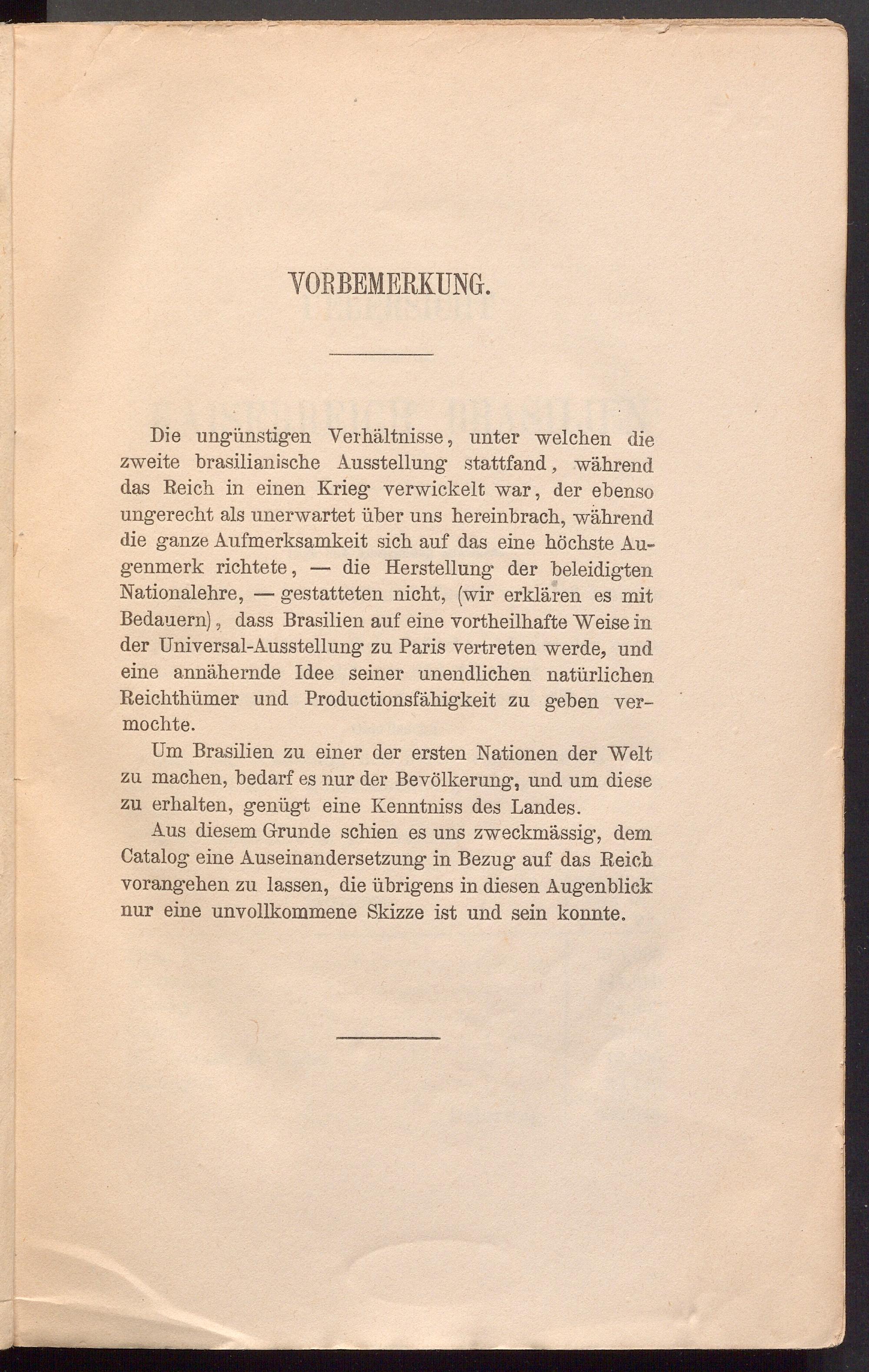 Die ungünstigen Verhältnisse, unter welchen die zweite brasilianische Ausstellung 1 stattfand, während das Reich in einen Krieg 1 verwickelt war, der ebenso ungerecht als unerwartet über uns hereinbrach, während, die ganze Aufmerksamkeit sich auf das eine höchste Augenmerk richtete, — die Herstellung der beleidigten Nationalehre, — gestatteten nicht, (wir erklären es mit Bedauern), dass Brasilien auf eine vortheilhafte Weise in der Universal-Ausstellung zu Paris vertreten werde, und eine annähernde Idee seiner unendlichen natürlichen Reichthümer und Productionsfähigkeit zu gehen vermochte.