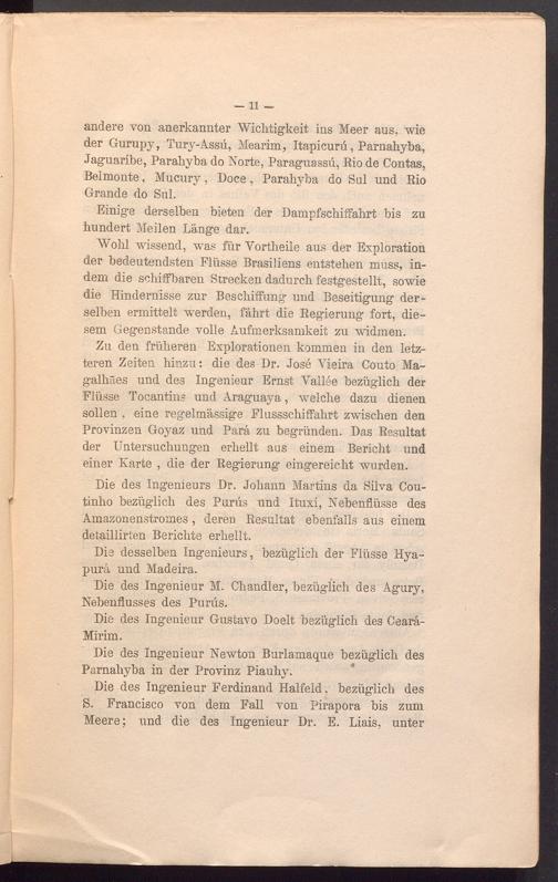 Wohl wissend, was für Vortheile aus der Exploration der bedeutendsten Flüsse Brasiliens entstehen muss, indem die schiffbaren Strecken dadurch festgestellt, sowie die Hindernisse zur Beschiffung und Beseitigung derselben ermittelt werden, fährt die Regierung fort, diesem Gegenstände volle Aufmerksamkeit zu widmen.