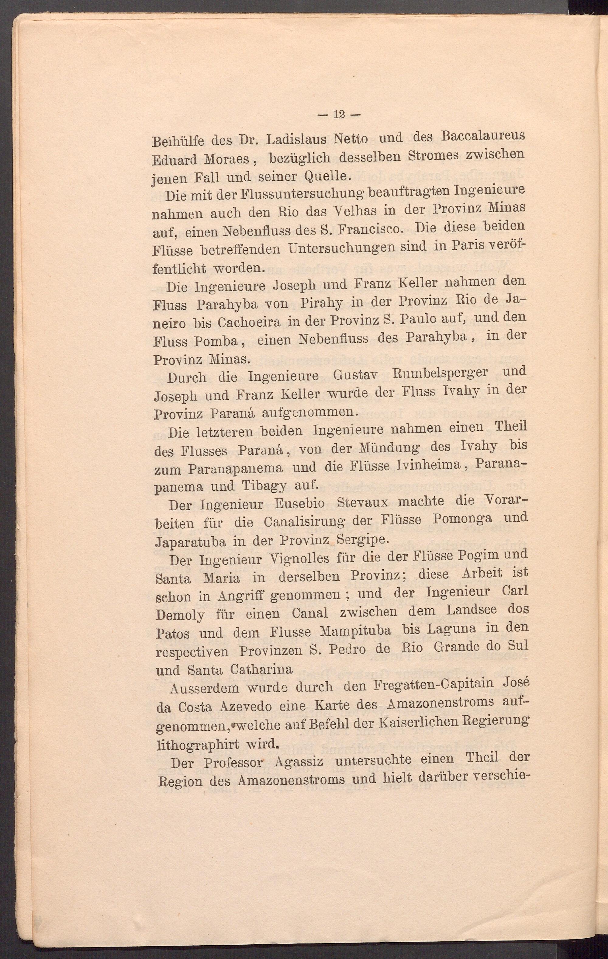 Die Ingenieure Joseph und Franz Keller nahmen den Fluss Parahyba von Pirahy in der Provinz Bio de Janeiro bis Cachoeira in der Provinz S. Paulo auf, und den Fluss Pomba, einen Nebenfluss des Parahyba, in der Provinz Minas.