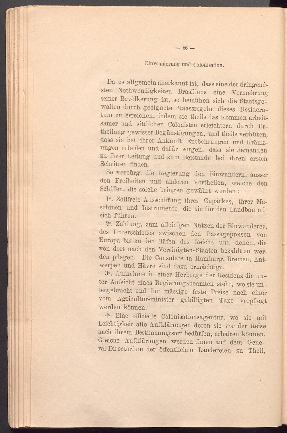 Da es allgemein anerkannt ist, dass eine der dringendsten Nothwendigkeiten Brasiliens eine Vermehrung seiner Bevölkerung ist, so bemühen sieh die Staatsgewalten durch geeignete Maassregein dieses Desideratum zu erreichen, indem sie theils das Kommen arbeitsamer und sittlicher Colonisten erleichtern durch Er- theilung gewisser Begünstigungen, und theils verhüten, dass sie bei ihrer Ankunft Entbehrungen und Kränkungen erleiden und dafür sorgen, dass sie Jemanden zu ihrer Leitung' und zum Beistände bei ihren ersten Schritten finden.