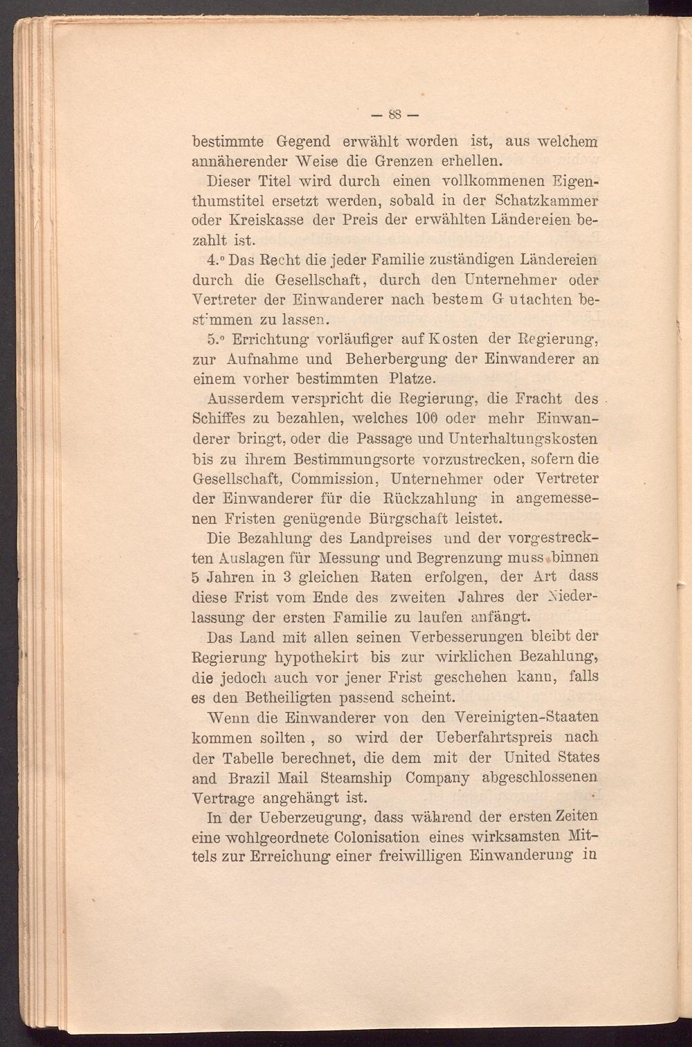 Ausserdem verspricht die Regierung, die Fracht des Schilfes zu bezahlen, welches 100 oder mehr Einwanderer bringt, oder die Passage und Unterhaltungskosten bis zu ihrem Bestimmungsorte vorzustrecken, sofern die Gesellschaft, Commission, Unternehmer oder Vertreter der Einwanderer für die Rückzahlung in angemessenen Fristen genügende Bürgschaft leistet.