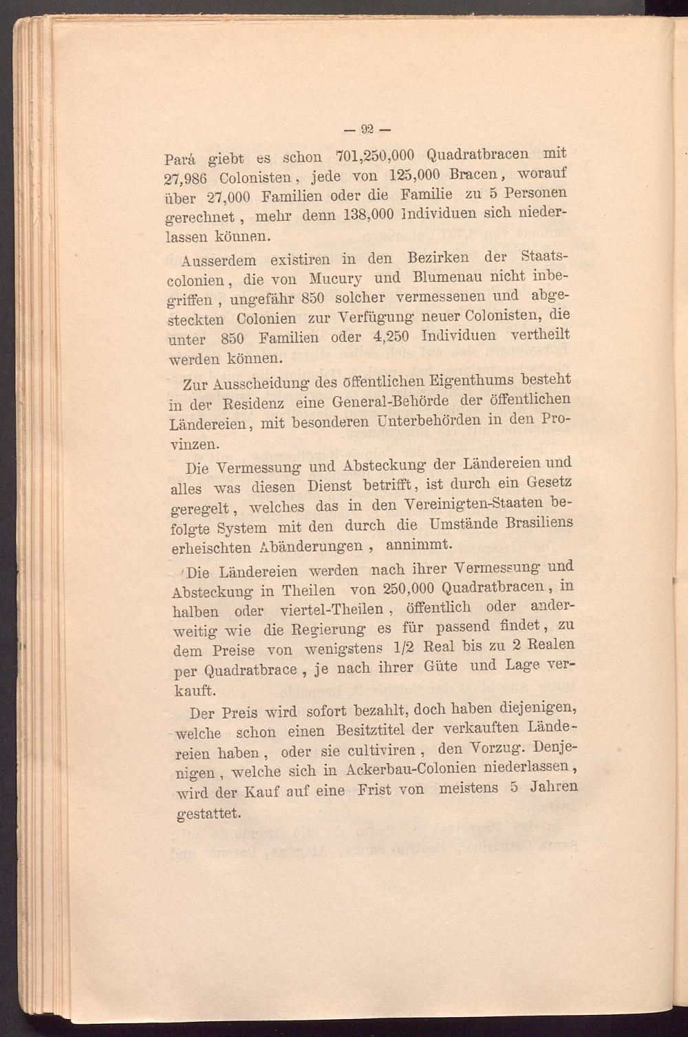 Para giebt es schon 701,250,000 Quadratbracen mit 27,986 Colonisten, jede von 125,000 Bracen, worauf über 27,000 Familien oder die Familie zu 5 Personen gerechnet , mehr denn 138,000 Individuen sich niederlassen können.